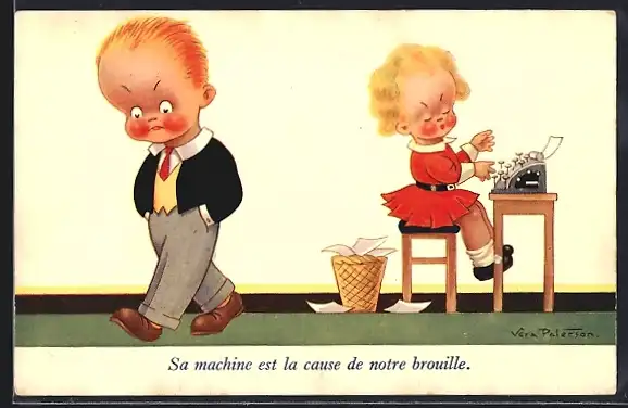 Künstler-AK Vera Paterson: Sa machine est la cause de notre brouille, Mädchen an einer Schreibmaschine