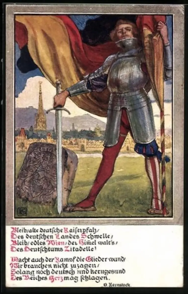 Künstler-AK Verein Südmark, Bleib, alte deutsche Kaiserpfalz, des deutschen Landes Schwelle..., Ritter mit Fahne