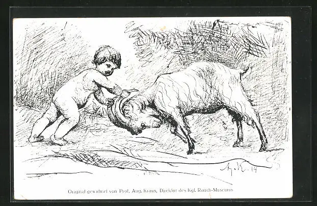 Künstler-AK Verein für Kinder-Volksküchen und Volkskinderhorte, Kind packt Widder bei den Hörnern
