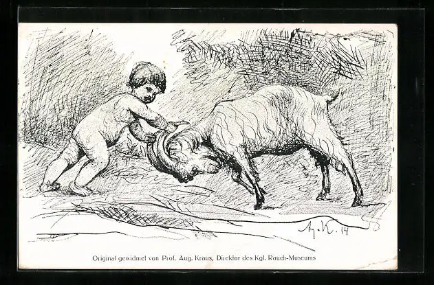 Künstler-AK Verein für Kinder-Volksküchen und Volkskinderhorte, Kind packt Widder bei den Hörnern