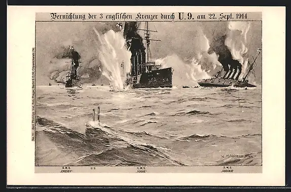 Künstler-AK Vernichtung der drei englischen Kreuzer durch U 9