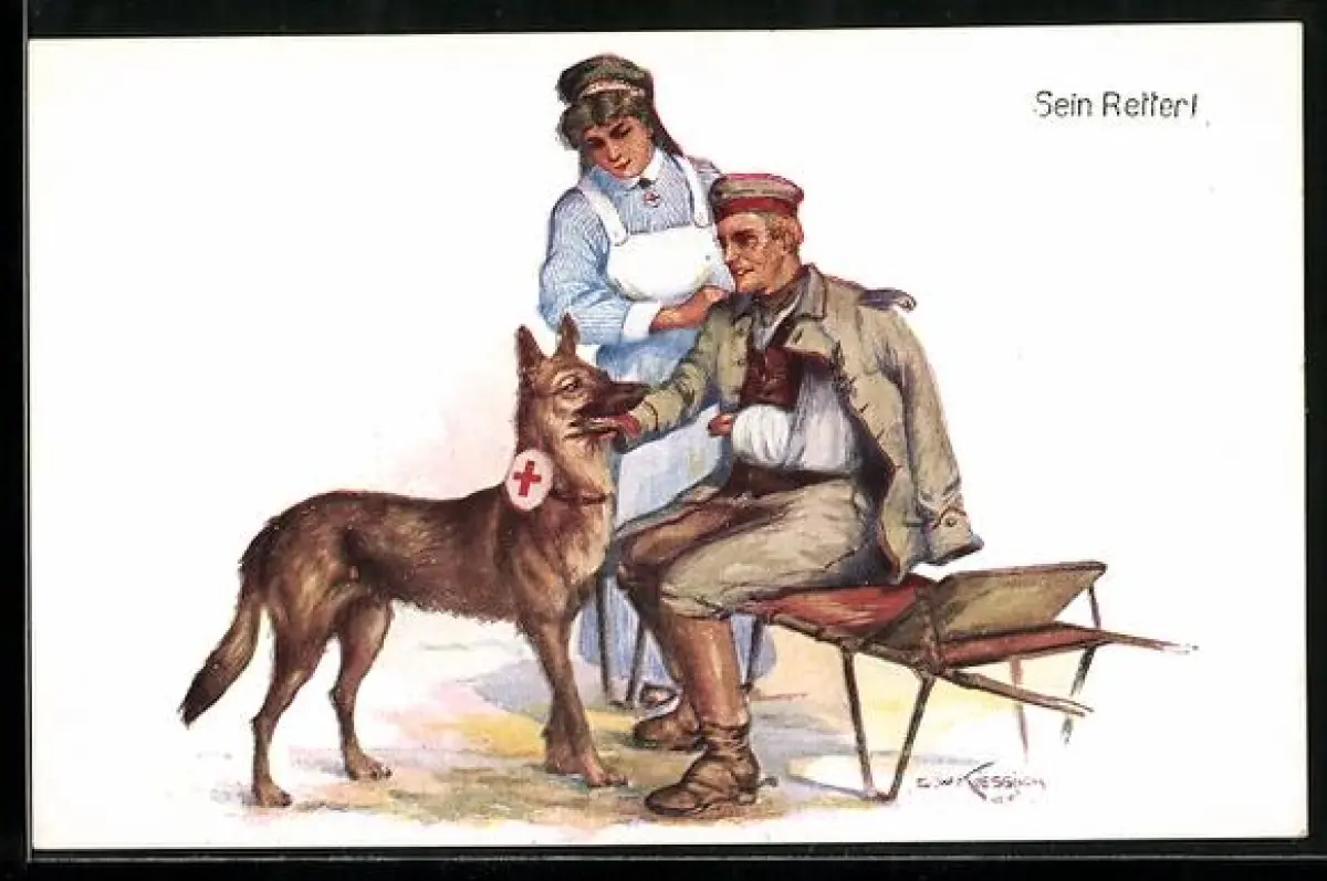 Künstler-AK Verwundeter Soldat mit Sanitätshund, Sein Retter