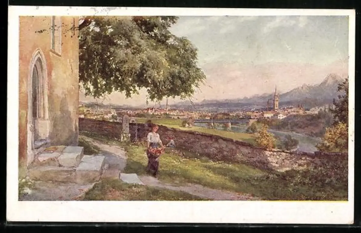 Künstler-AK Villach, Gartenpartie mit Blick auf den Ort