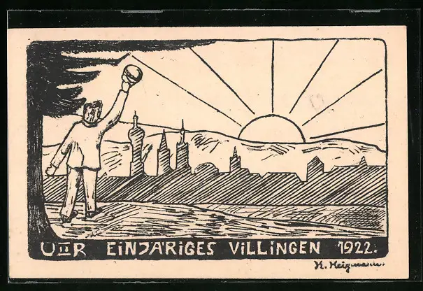 Künstler-AK Villingen, Einjähriges 1922, Ortspartie u. Student bei Sonnenschein, Absolvia