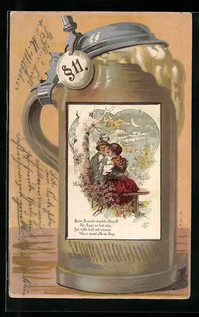 Künstler-AK Voller Bierkrug einer Brauerei mit Abbildung eines liebenden Paares