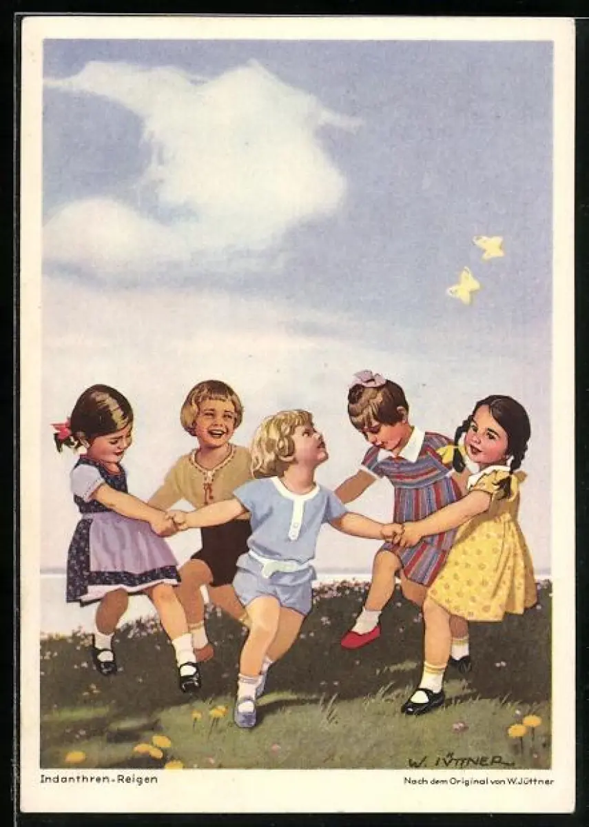 Künstler-AK W.I.: Kleinkinder beim Ringelreihen, Reklame für Indanthren Textilien