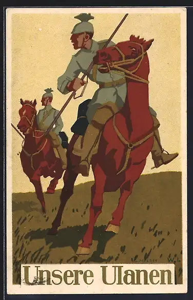 Künstler-AK W.I.: Unsere Ulanen, Ulanen in Uniform an der Front