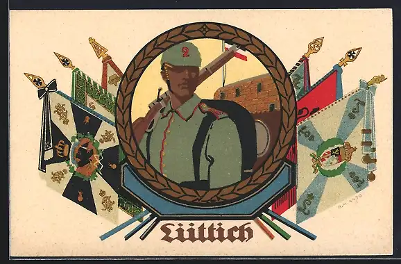 Künstler-AK W.I. unsign.: Lüttich, Deutscher Soldat in Uniform, Regimentsfahnen