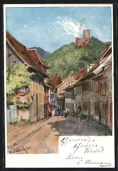 Künstler-AK Waldkirch, Strassenpartie mit Ruine