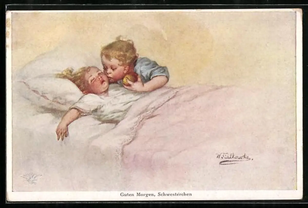 Künstler-AK Wally Fialkowska: Kleiner Junge weckt sein Schwesterchen