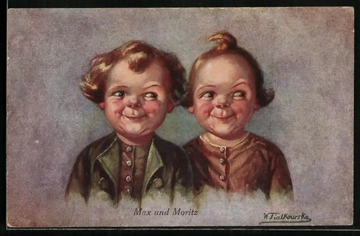 Künstler-AK Wally Fialkowska: Max und Moritz lächeln bübisch