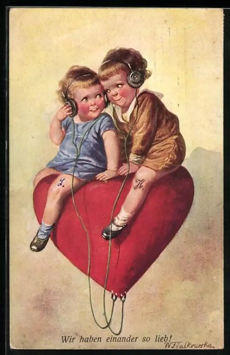 Künstler-AK Wally Fialkowska: Wir haben einander so lieb!, Kinder mit Kopfhörern auf Herz