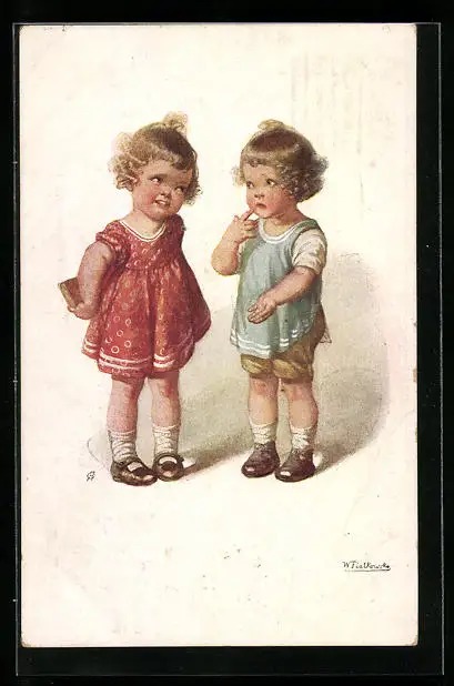 Künstler-AK Wally Fialkowska: Zwei Mädchen mit verstecktem Geschenk