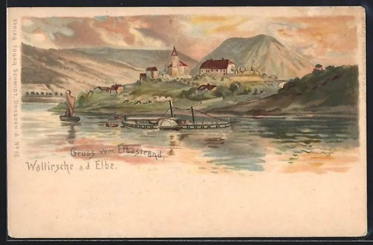 Künstler-AK Waltirsche a. d. Elbe, Ortsansicht von der Elbe aus, Raddampfer