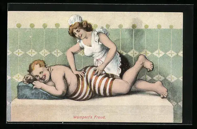 Künstler-AK Wamperls Freud, beleibter Mann bekommt eine Massage