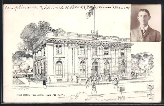 Künstler-AK Waterloo, IA, Post Office, Portrait Herr im Anzug