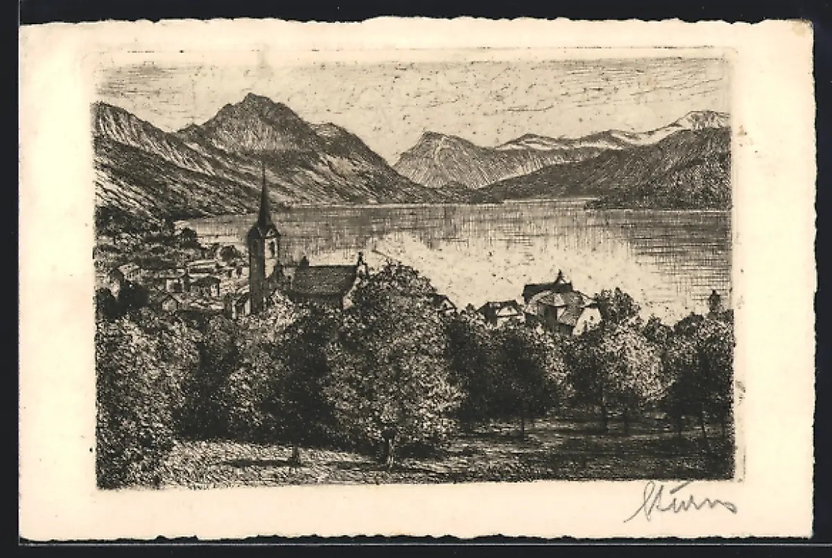 Künstler-AK Weggis, Uferpartie mit Kirche