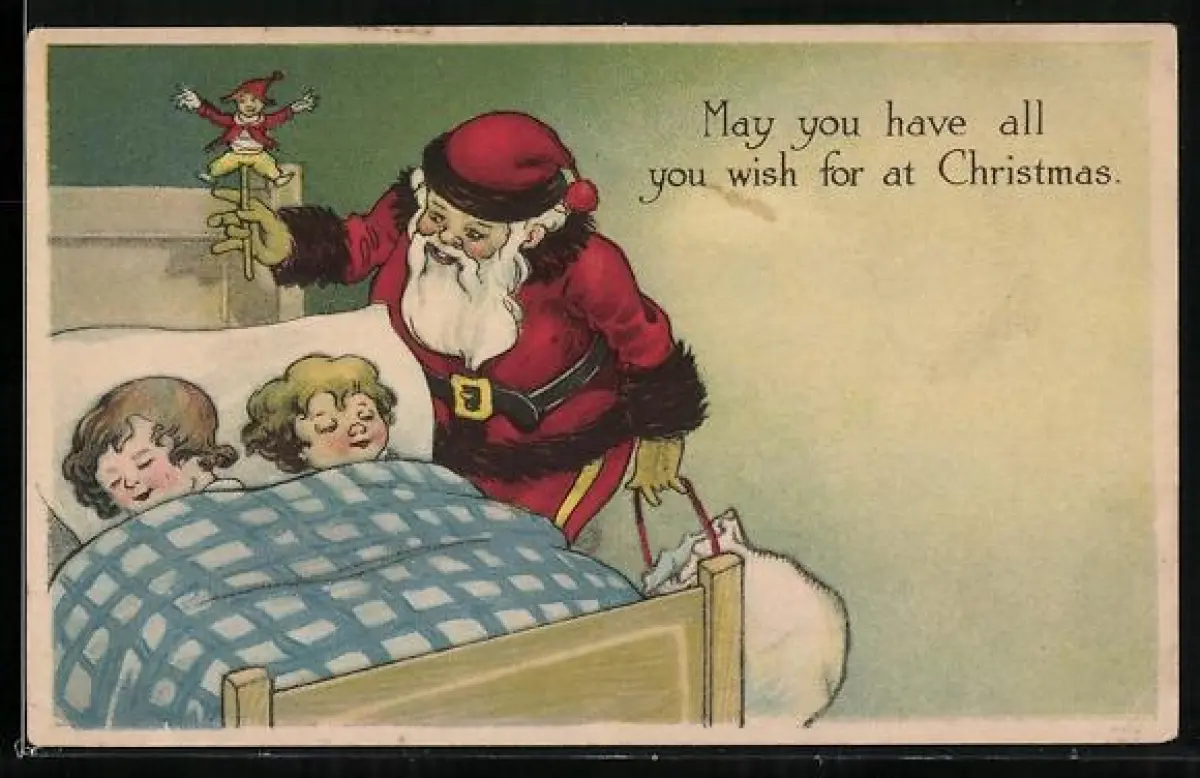 Künstler-AK Weihnachtsmann bringt schlafenden Kindern Geschenke