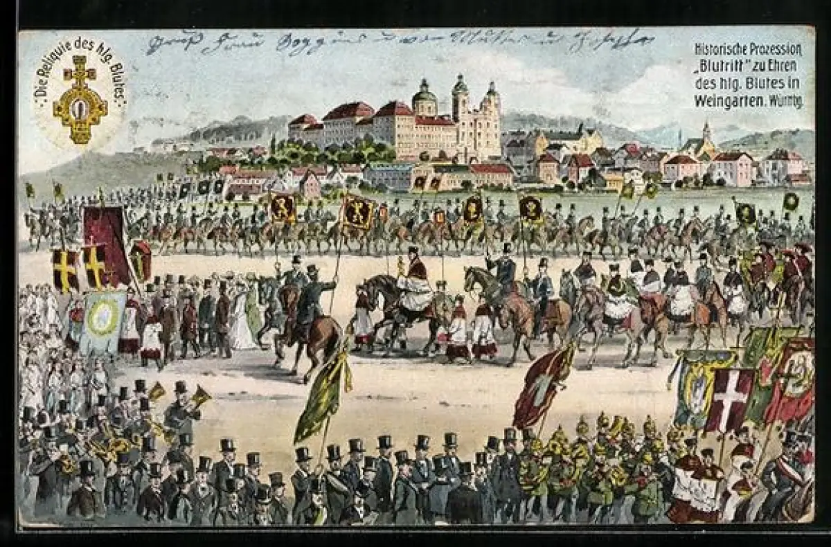 Künstler-AK Weingarten /Württbg., Blutritt-Prozession, Basilika, historische Ansicht