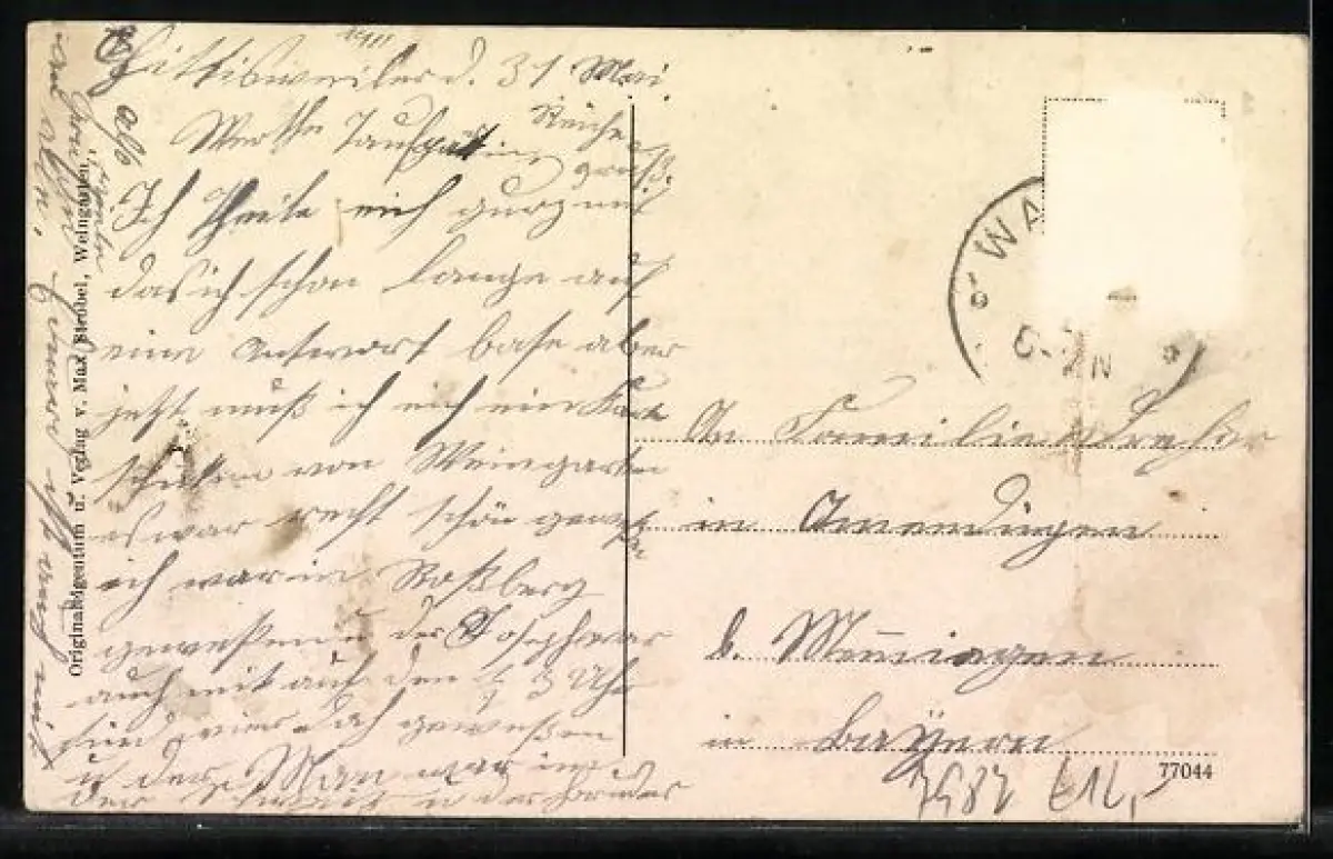 alte Ansichtskarte, gelaufen, Briefmarke entfernt, rückseitig Oberflächenschaden, guter Zustand