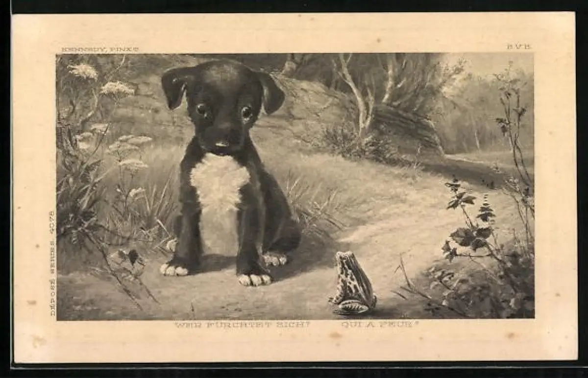 Künstler-AK Welpe starrt verwirrt einen Frosch an