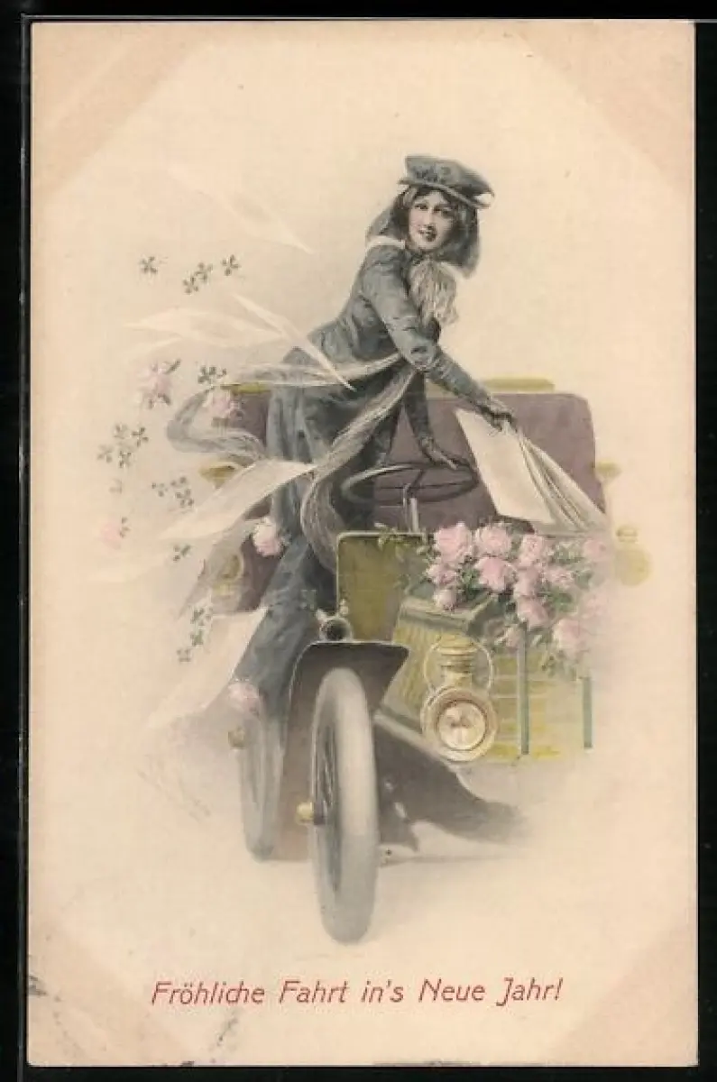 Künstler-AK Wichera: Fröhliche Fahrt in`s Neue Jahr!, Dame in Automobil