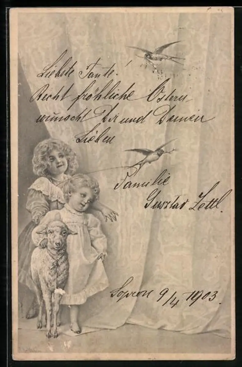 Künstler-AK Wichera: Zwei kleine Kinder mit einem Lämmchen und Schwalben