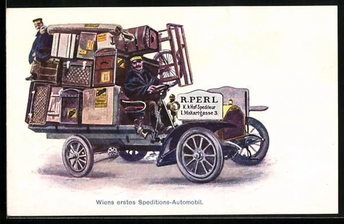 Künstler-AK Wien, Erster Speditions-Lastkraftwagen von R. Perl, Makartgasse 3