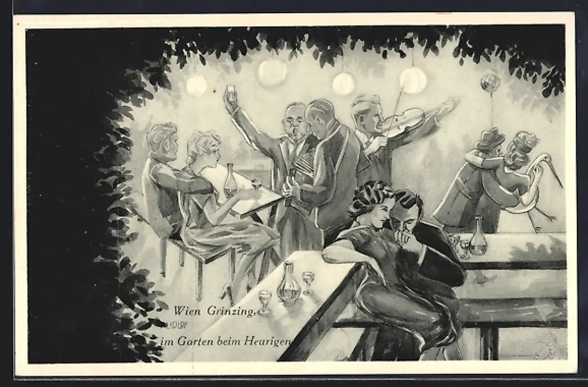 Künstler-AK Wien, Im Garten beim Heurigen in Grinzing