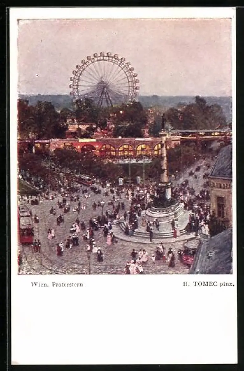 Künstler-AK Wien, Praterstern mit Denkmal und Strassenbahn