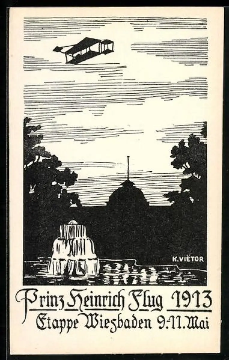 Künstler-AK Wiesbaden, Prinz Heinrich Flug 1913, Etappe Wiesbaden 9.-11. Mai, Doppeldeckerflugzeug