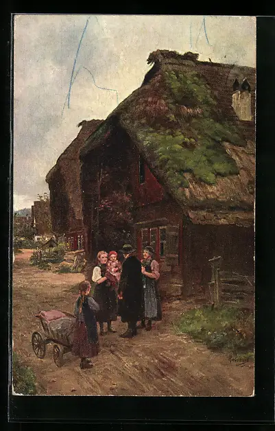 Künstler-AK Wilhelm Hasemann: In der Dorfgasse, Schwarzwald, reetgedeckte Häuser