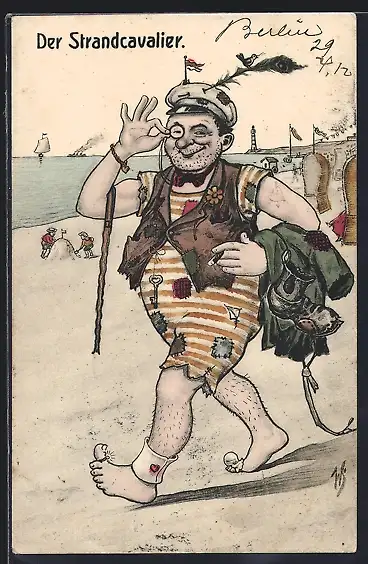 Künstler-AK Willi Scheuermann: Der Strandcavalier, zerlumpter Mann in Bademode
