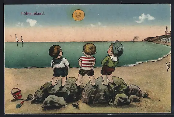 Künstler-AK Willi Scheuermann: Höhenrekord, Drei kleine Stehpinkler am Meer