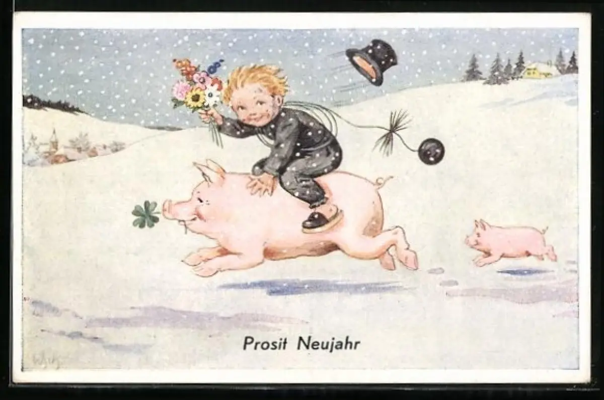 Künstler-AK Willi Scheuermann: Kleiner Schornsteinfeger reitet auf einem Schwein mit Klee im Mund