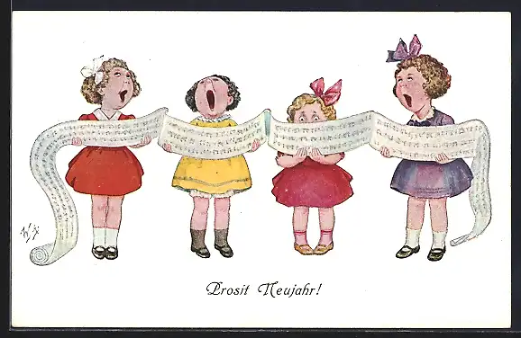 Künstler-AK Willi Scheuermann: Vier kleine Damen singen aus Leibeskräften im Chor, Neujahrsgruss