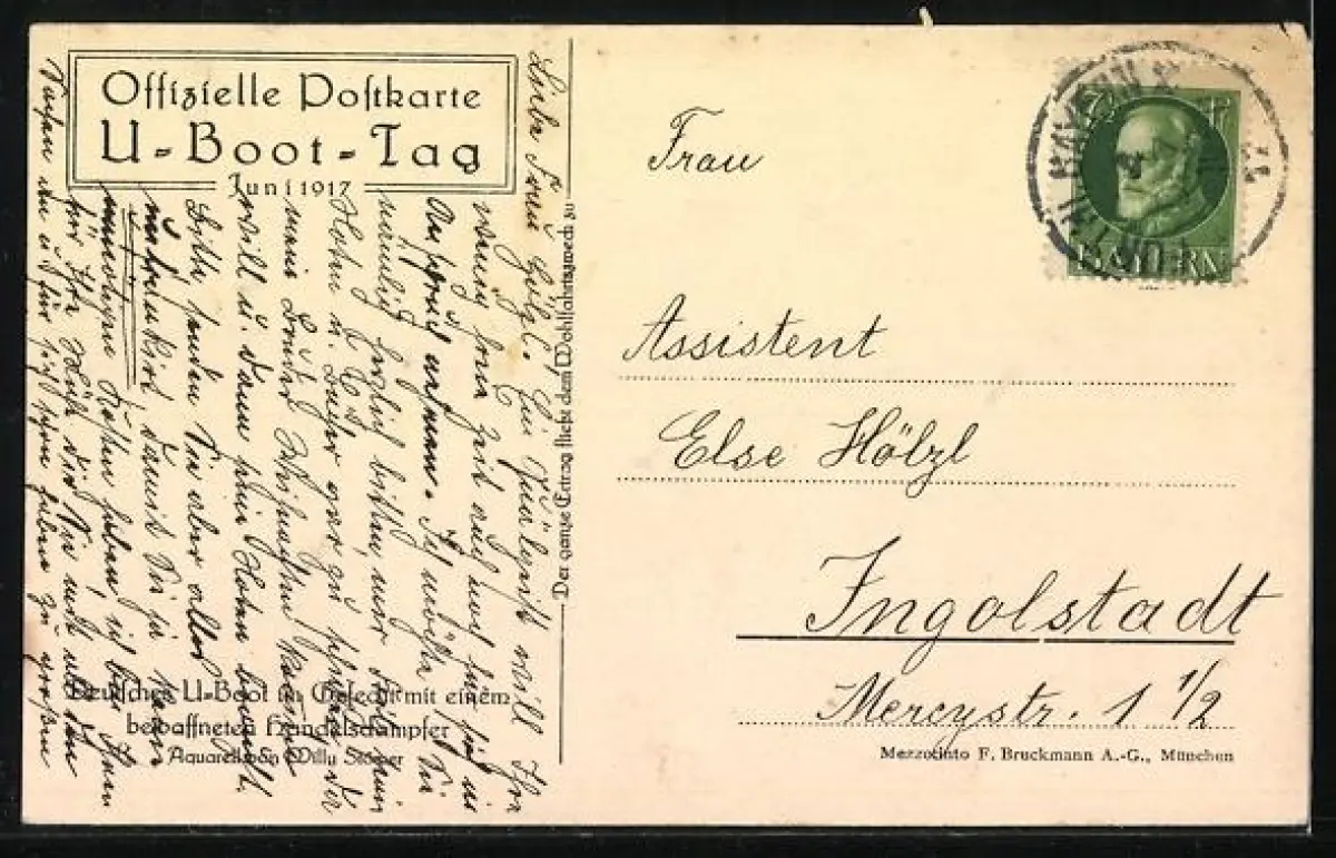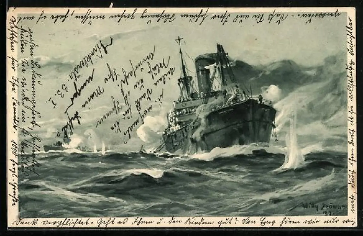 Künstler-AK Willy Stoewer: Deutsches U-Boot im Gefecht mit bewaffnetem Handelsdampfer im Sperrgebiet