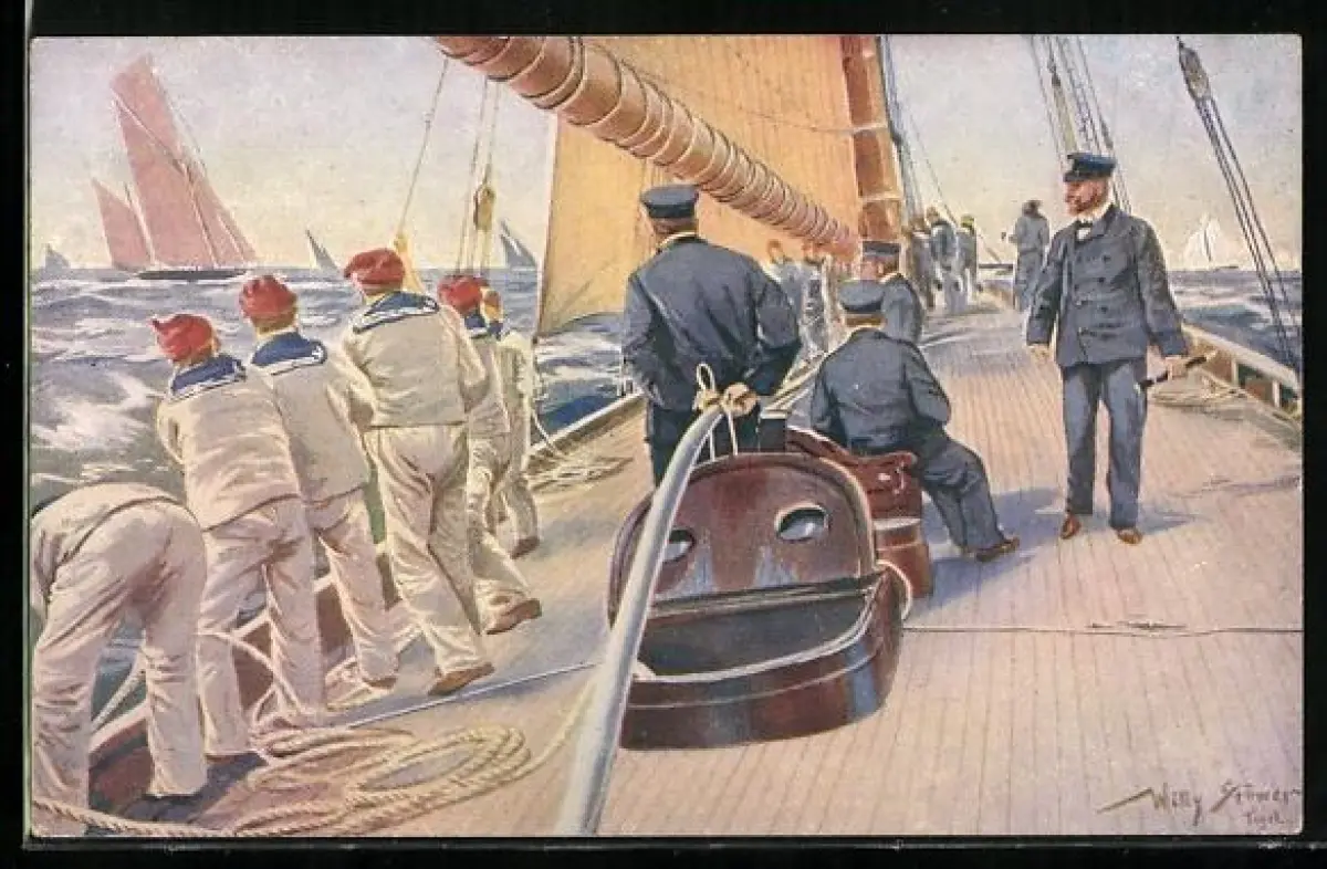 Künstler-AK Willy Stoewer: Matrosen beim Segelsetzen