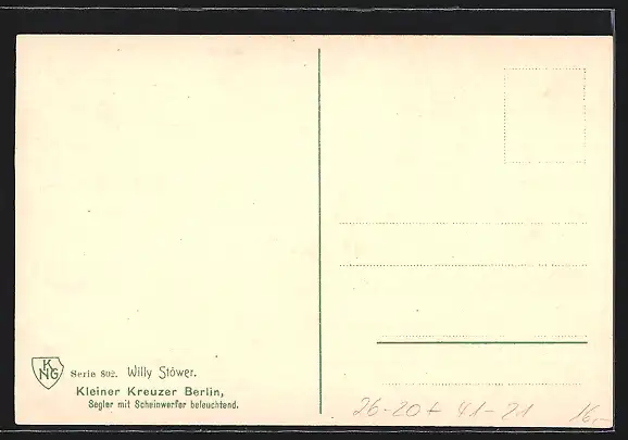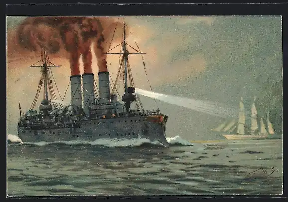 Künstler-AK Willy Stoewer: SMS Kleiner Kreuzer Berlin beleuchted einen Segler mit dem Scheinwerfer