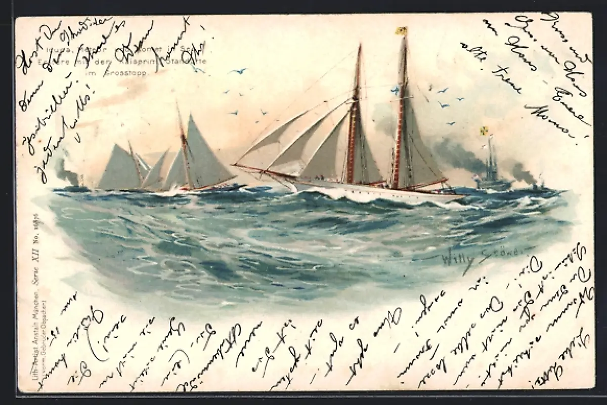 Künstler-AK Willy Stoewer: Segelyachten Iduna, Meteor und Komet in See