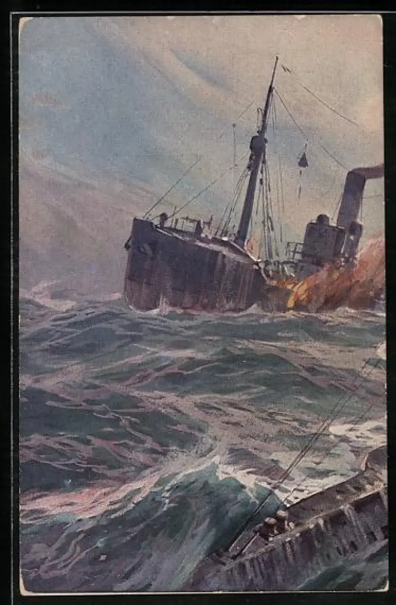 Künstler-AK Willy Stoewer: U-Boot hat ein Transportschiff in Brand geschossen