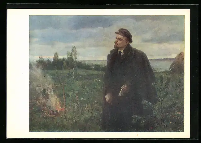 Künstler-AK Wladimir Iljitsch Lenin hockt an einem Lagerfeuer