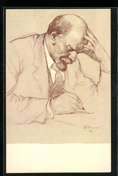 Künstler-AK Wladimir Iljitsch Lenin in nachdenklicher Pose beim Schreiben