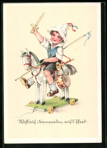 Künstler-AK Wohlauf, Kameraden, auf`s Pferd, Bub spielt Soldat