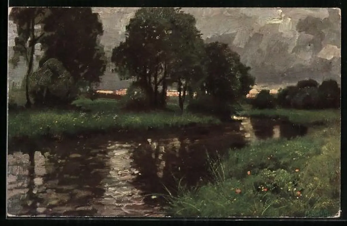 Künstler-AK Wohlgemuth & Lissner, Primus-Postkarte No. 825: Fluss unter dunklen Wolken