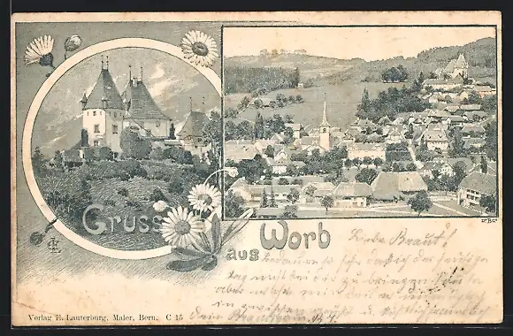 Künstler-AK Worb, Gebäude mit Turm, Ortsansicht aus der Vogelschau