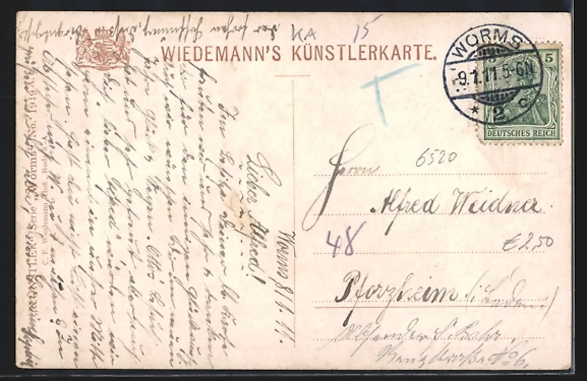 Künstler-AK Worms, Ludwigsplatz mit Martinskirche