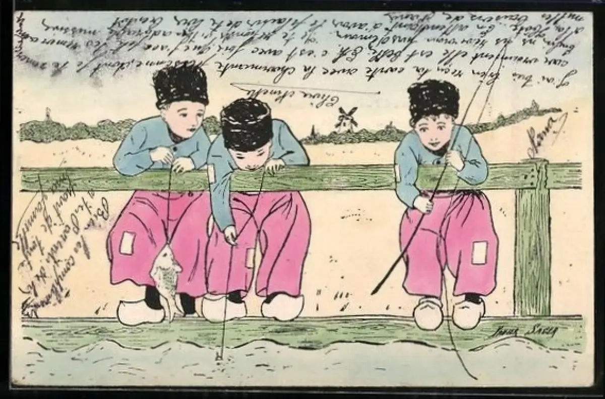 Künstler-AK Xavier Sager: Drei Jungen mit Fellmützen beim Fischen