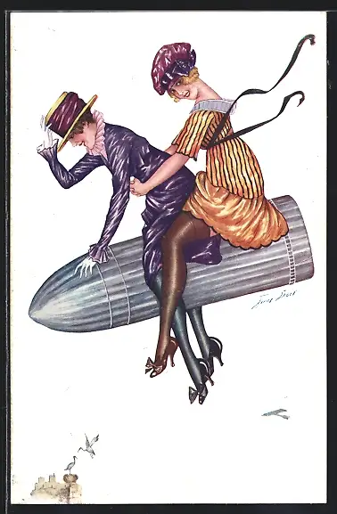 Künstler-AK Xavier Sager: Frau sitzen auf enem schweren Geschoss