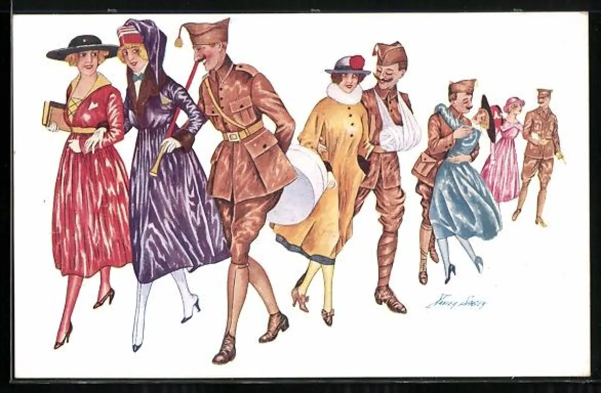 Künstler-AK Xavier Sager: Soldaten gehen mit hübschen Frauen spazieren, Les Alliés à Paris